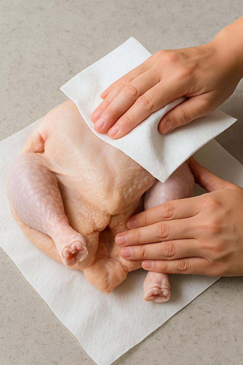 - 키친타월로 닦기: 핏물이나 겉면의 이물질이 걱정된다면, 흐르는 물 대신 깨끗한 키친타월로 닭의 표면을 가볍게 닦아주는 것으로 충분합니다.