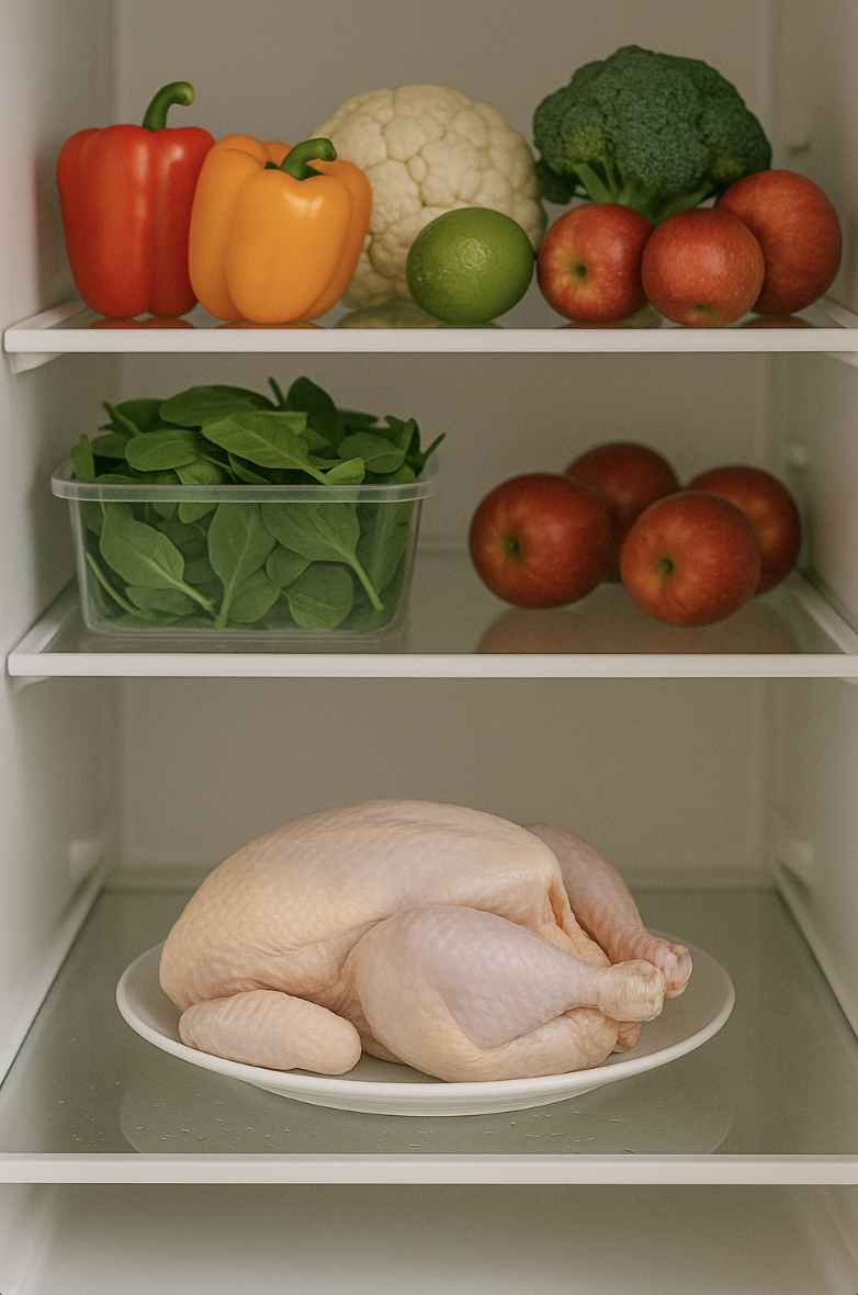 - 채소, 과일과 분리 보관: 생닭은 냉장 보관 시에도 비가열 식재료와 분리해 보관해야 교차오염을 막을 수 있습니다.